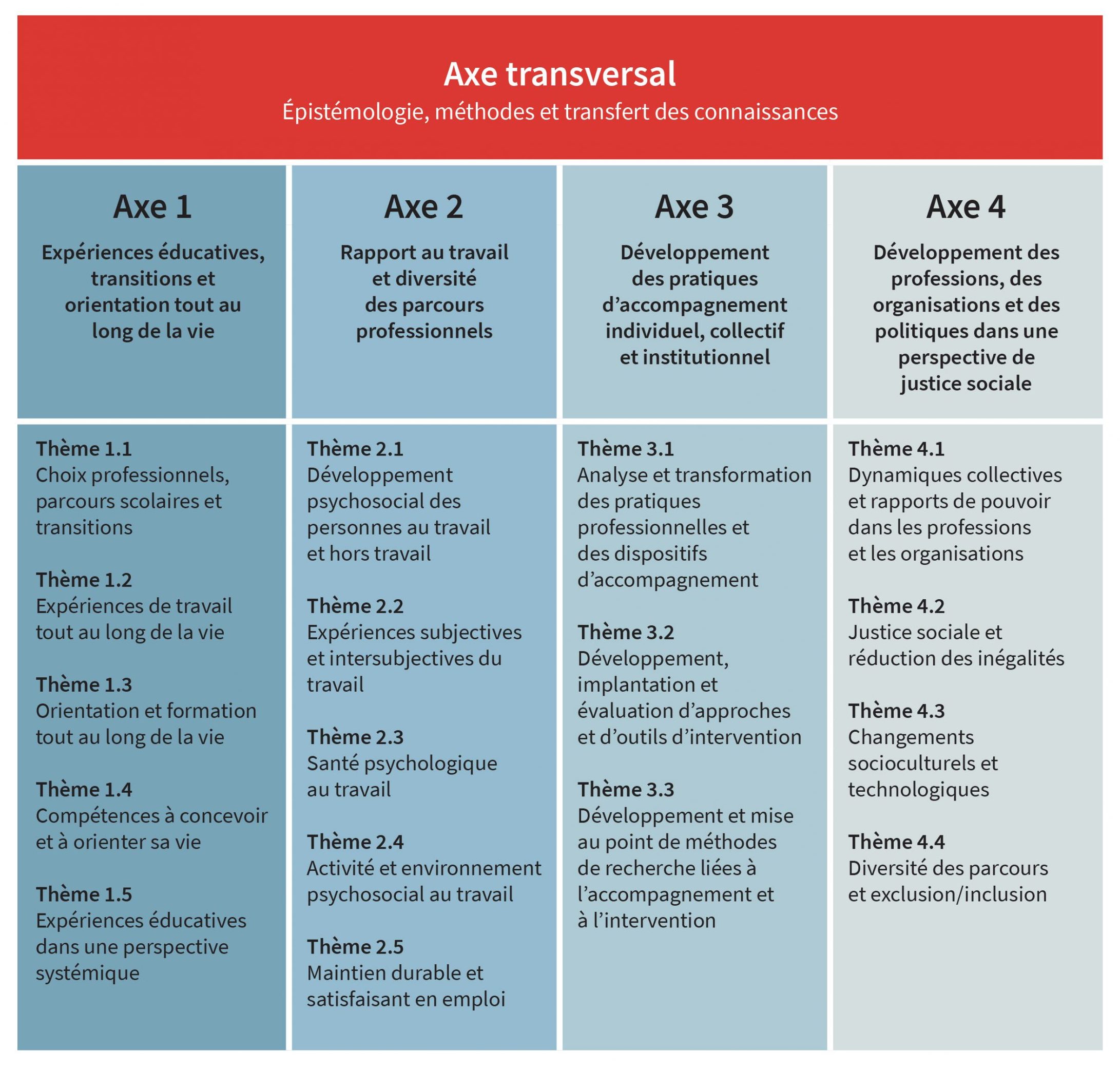 • développer une réflexion critique en ce qui a trait à la portée réelle des interventions professionnelles et des savoirs scientifiques adoptés dans les collectivités, les organisations et les institutions sociales, dont le système d’éducation et le système de production, et ce, dans une perspective de justice sociale (axe 4).